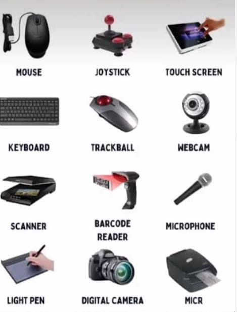 इनपुट उपकरणों के उदाहरणों में कीबोर्ड, माउस, स्कैनर, डिजिटल कैमरा, जॉयस्टिक और माइक्रोफोन शामिल हैं।