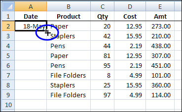 - Click cell A11 and move the mouse pointer over the fill handle. The mouse pointer becomes a black crosshair, as shown in this figure. Drag the fill handle down to cell A22. The first year of dates fill in the cells, as shown in above figure.