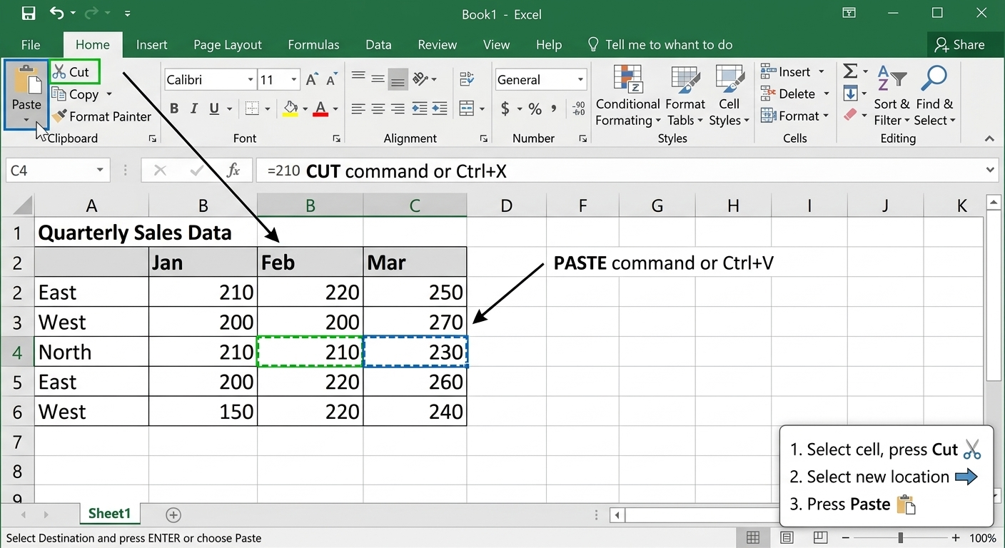 - The cut content will be removed from the original cells and pasted into the selected cells.