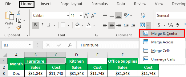 When you merge two or more adjacent horizontal or vertical cells, the cells become one large cell that is displayed across multiple columns or rows. The contents of one of the cells appear in the center of the merged cell. It is often used to create labels that span multiple columns.